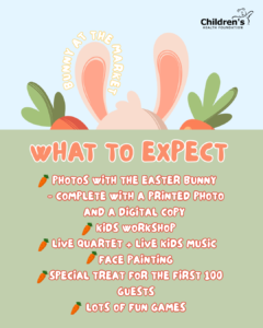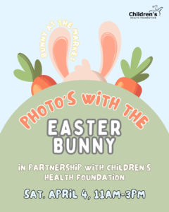 Join us for a fun-filled Easter celebration at The Market on Saturday, April 4 from 11 AM – 3 PM! In partnership with the Children’s Health Foundation, this special community event supports local kids and families. The event is free to attend, and donations to the foundation are always appreciated, every dollar helps make a difference💛