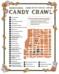 Attendees can partake in a costume contest by posting their costume while they are in downtown London on Facebook or Instagram using the hashtag #LDNCandyCrawl. Prizes for 1st – 4th place include Retail, Eats & Treats, Events, and Wellness packages, all valued at over $200 from participating businesses and locations.