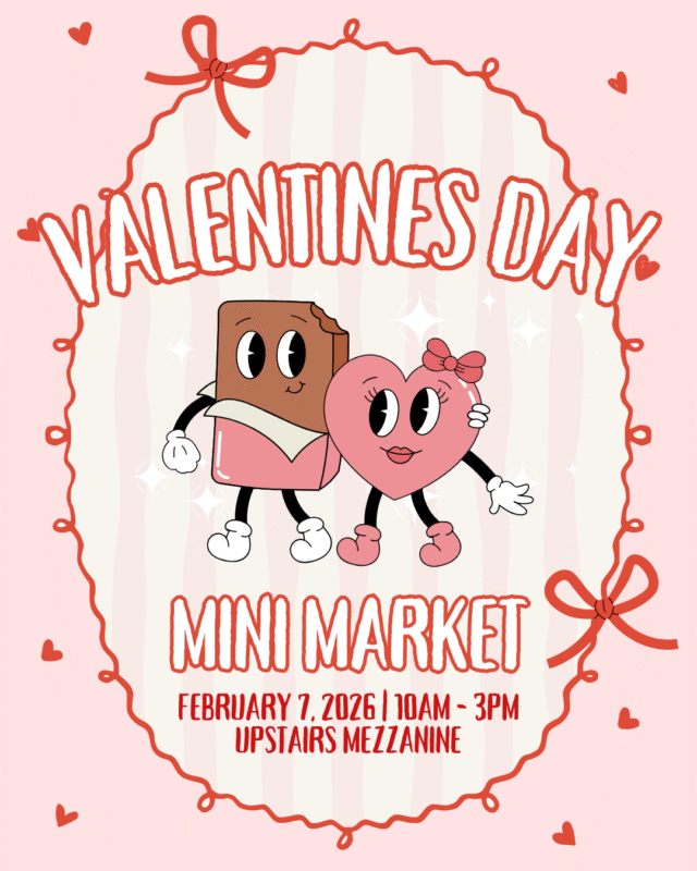 Join usĀ Saturday, February 7th from 10amā3pm,Ā upstairs in the Mezzanine, for a sweet day filled with fresh treats, local vendors, live music, and Valentineās-inspired workshops. Itās the perfect place to shop small, sip something cozy, and soak up all the love.